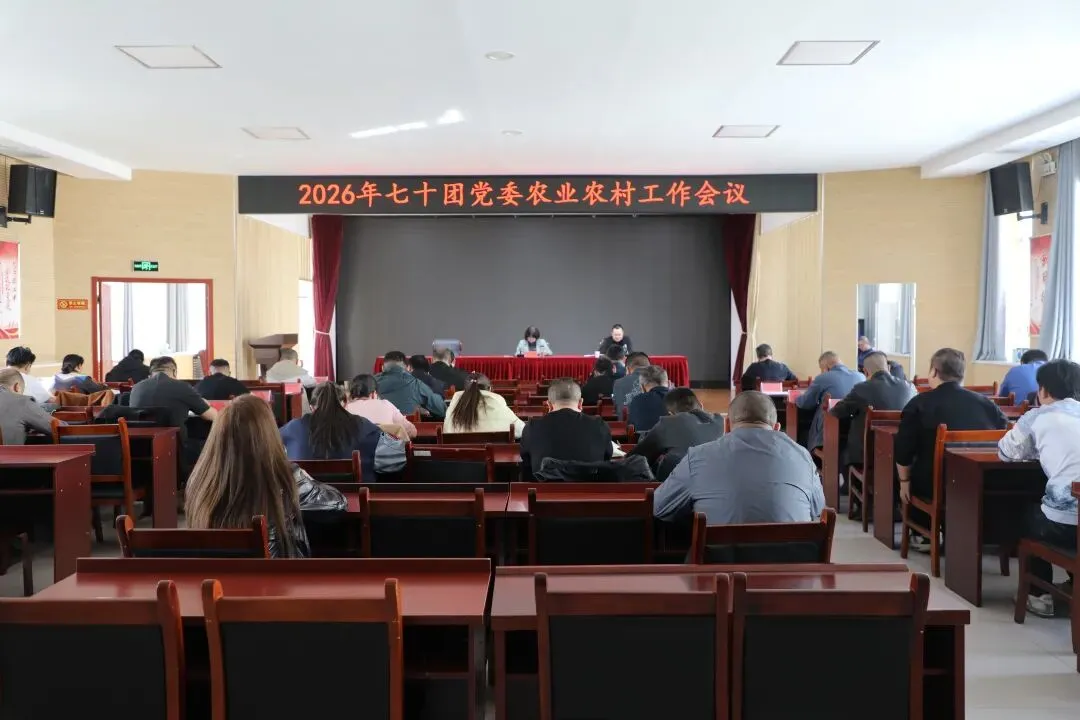 3月18日,七十团召开2026年党委农村工作会议,全面部署年度“三农”重点工作,动员全团上下凝心聚力、真抓实干,奋力开创现代农业高质量发展新局面。团党委副书记、团长张鸿静出席会议并作讲话,副政委郭冠军主持会议,机关事业单位负责人、各连队负责人及农业负责人代表参加会议。
