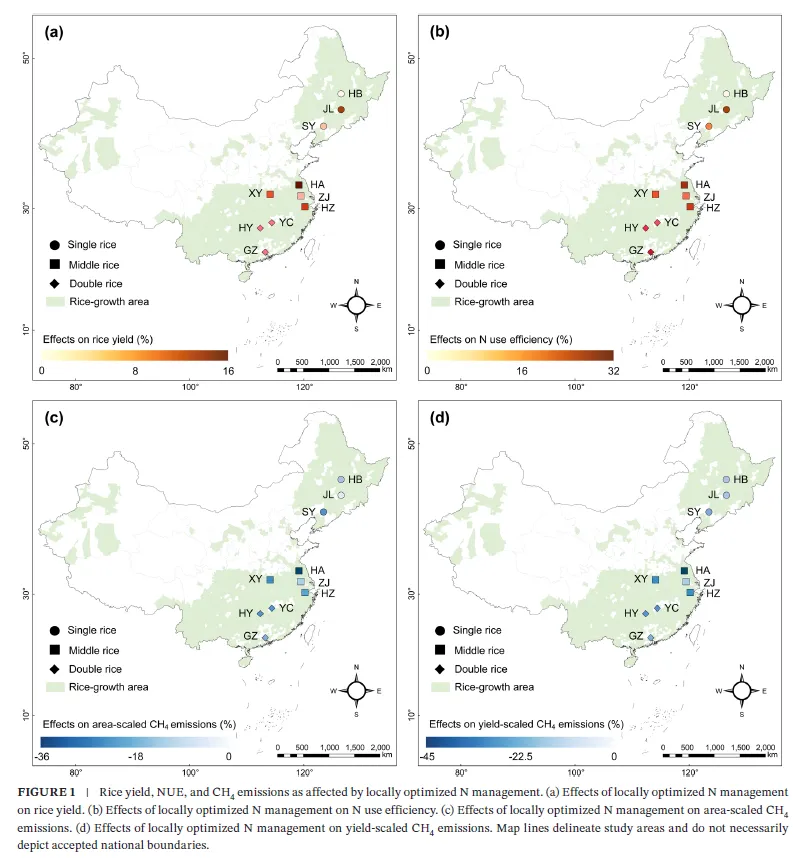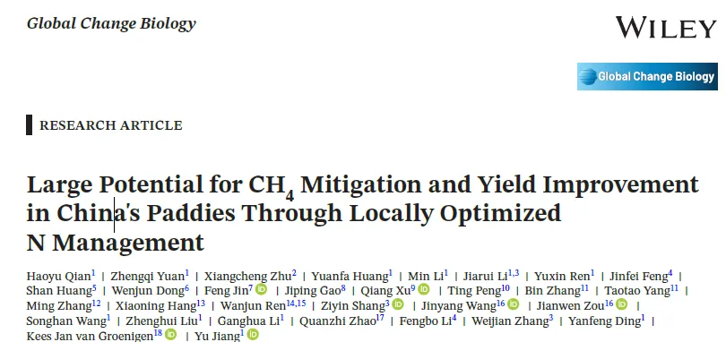 南京农业大学江喻教授团队在《Global Change Biology》上发表了题为《Large Potential for CH4 Mitigation and Yield Improvement in China's Paddies Through Locally Optimized N Management》的研究论文。该研究通过整合多区域田间试验数据并结合机器学习方法,系统评估了因地制宜的氮管理策略在中国水稻生产中实现甲烷减排与产量提升的潜力,发现局地优化的氮管理可同步降低水稻甲烷排放并提高产量,实现农业生产与气候目标的协同优化。南京农业大学江喻教授与中国水稻研究所李凤博副研究员为该论文共同通讯作者。