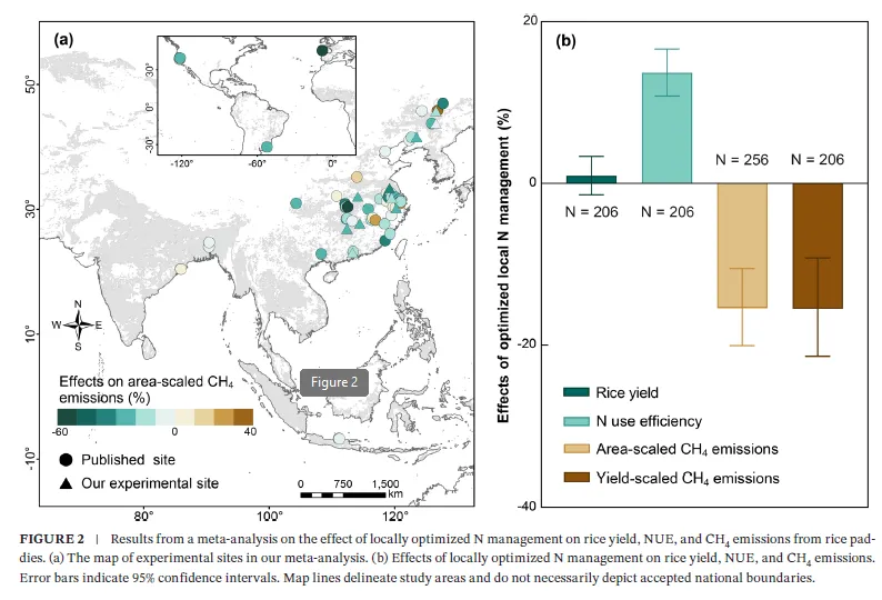 氮(Nitrogen, N)是农业生产中最核心的限制性养分之一,对保障粮食安全具有关键作用。然而,传统高投入的施氮模式不仅导致氮素利用效率偏低,还会引发一系列生态环境问题,包括氮淋失、氮氧化物排放以及温室气体增加等。在水稻种植系统中,由于长期淹水形成的强还原环境,甲烷(CH₄)成为主要的温室气体排放形式,其对全球变暖的贡献显著高于二氧化碳。在“双碳”背景下,如何在保障水稻稳产高产的同时降低甲烷排放,已成为农业生态学与全球变化研究的核心问题之一。已有研究表明,氮管理措施对水稻产量具有显著影响,但其对甲烷排放的调控作用仍存在较大不确定性,尤其是不同区域环境条件差异导致的响应异质性尚未被系统量化。同时,现有IPCC温室气体核算方法(Tier 1)尚未充分纳入精细化管理措施的影响,限制了评估精度。
