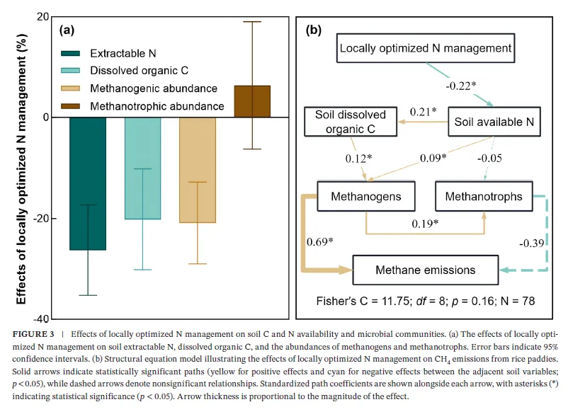 (1)优化氮管理显著降低甲烷排放:基于多区域田间试验的Meta分析结果表明,与传统施氮方式相比,局地优化氮管理措施(如延迟施肥、减少施氮量及深施等)可使水稻田甲烷排放降低约16%–21%。这一结果表明,氮管理不仅调控氮循环过程,也显著影响碳循环中的温室气体释放。