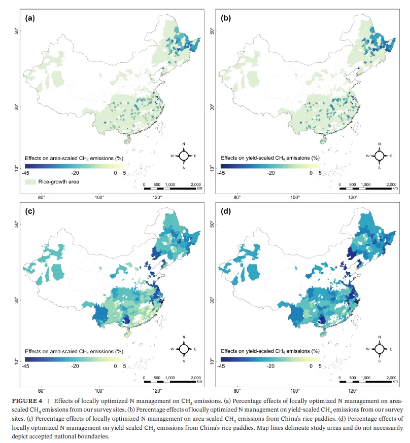 (3)区域尺度下的“减排—增产”协同效应:结合中国155个县的实地调查数据,并利用机器学习模型进行区域外推,结果显示:若在全国水稻种植区推广优化氮管理策略,可实现约16%的甲烷减排,同时水稻产量提升约7%。这一发现打破了“减排必然牺牲产量”的传统认知,揭示了农业管理优化的巨大潜力。