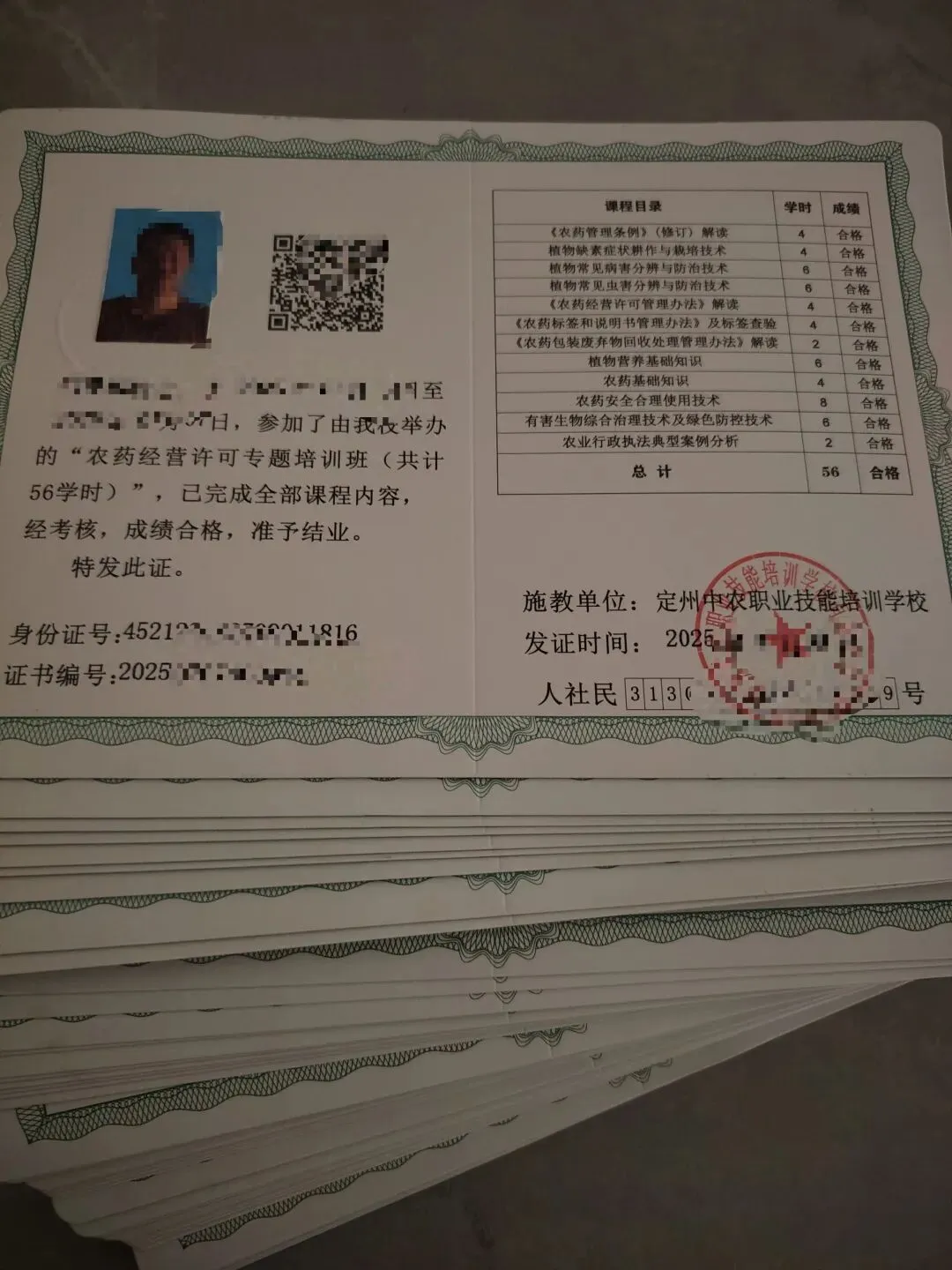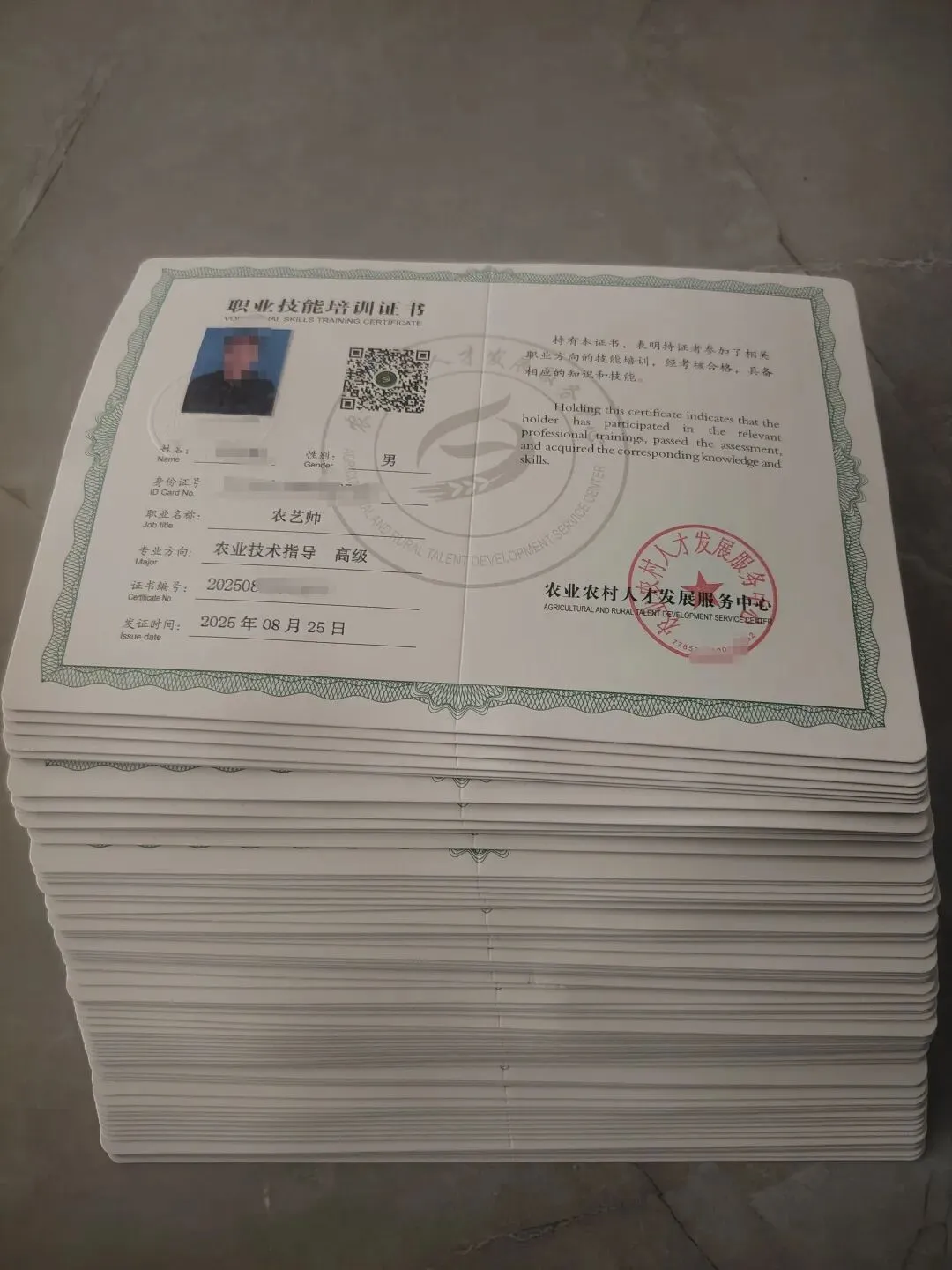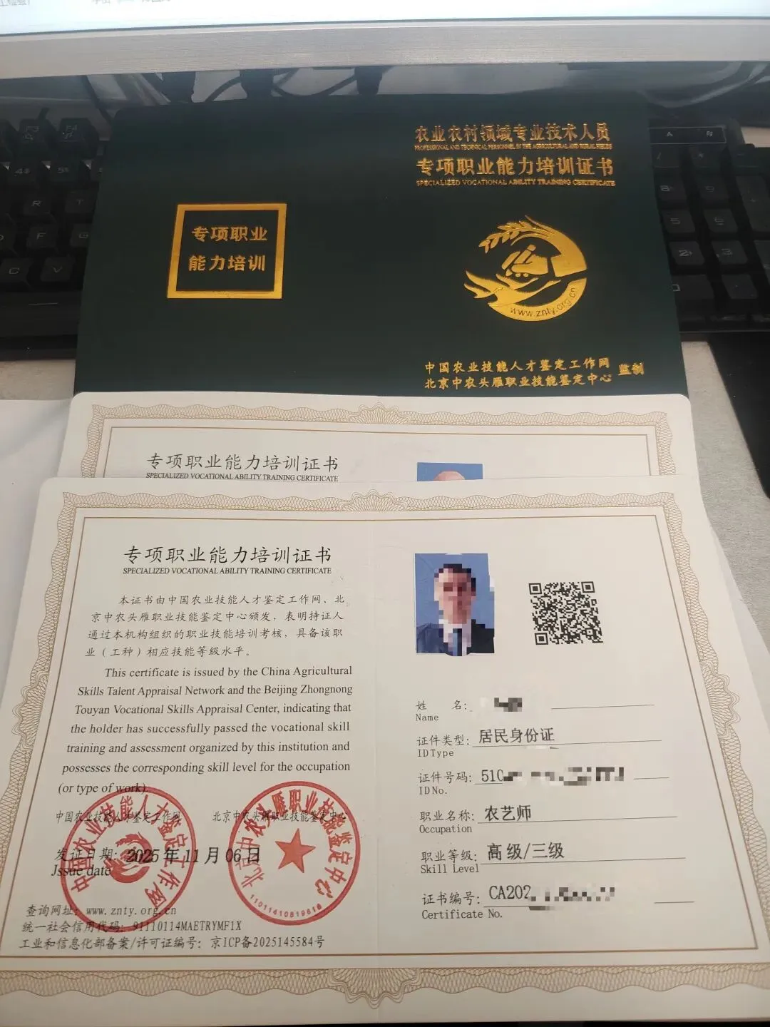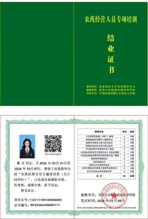 农业证书:中国农业技能人才鉴定工作网;农业农村人才发展服务中心;定州中农职业技能培训学校