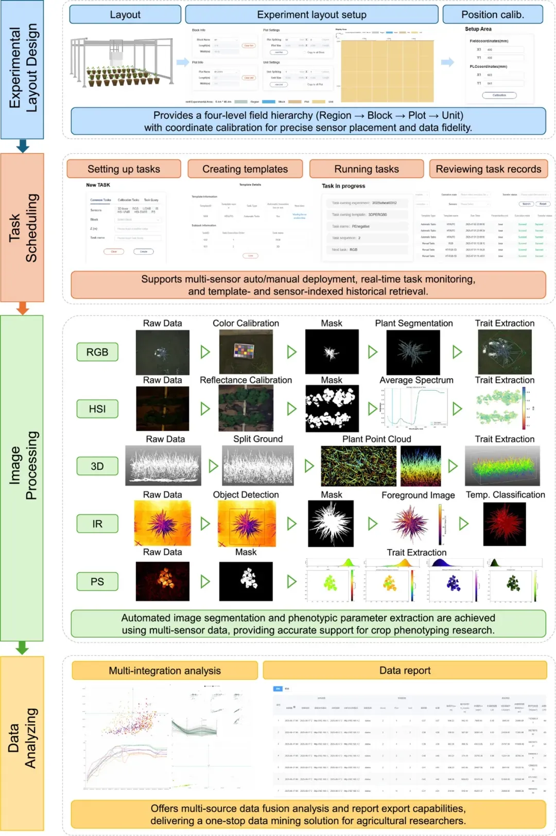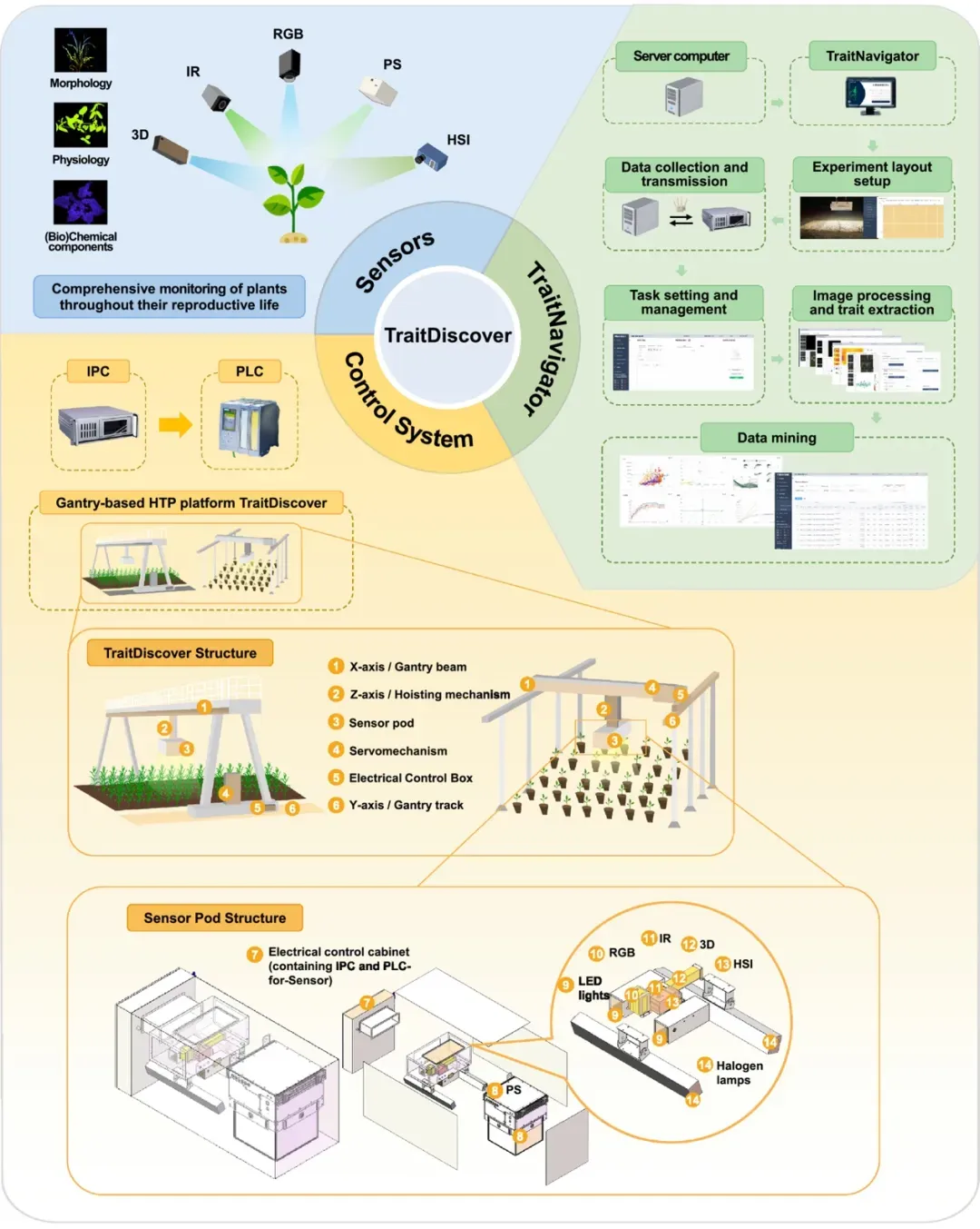 TraitDiscover 平台以 “传感器是眼睛,自动化是身体,软件是大脑” 的三位一体筑表型技术框架为核心,将传感、运动与分析功能高度集成于模块化的 “传感器到植物” 一体化平台,由毫米级精度三轴控制系统、多源传感器吊舱、云架构软件大脑 TraitNavigator 三大核心模块紧密耦合而成,实现从数据采集到分析的全流程精准可控。