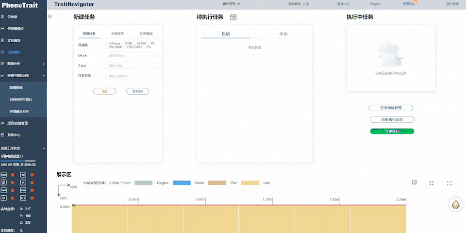 所有硬件设备均由基于云服务架构的TraitNavigator统一协调,通过直观化操作界面完成路径规划、任务配置、传感器触发、数据采集与实时分析,让从实验设计到表型结果输出的全环节,兼具精度可靠、通量高效、扩展灵活的核心特性。
