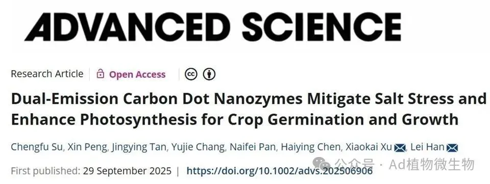 近日,青岛农业大学农学院博导韩磊教授团队在盐碱地作物抗逆与生长促进领域取得了突破性进展。该团队成功合成了一种新型碳点纳米酶,在不依赖基因编辑技术或有机农药的前提下,显著提升了作物的耐盐碱能力。这项重要成果已发表在国际顶尖SCI期刊Advanced Science上,该期刊位列中国科学院1区TOP行列,五年影响因子高达15.6。