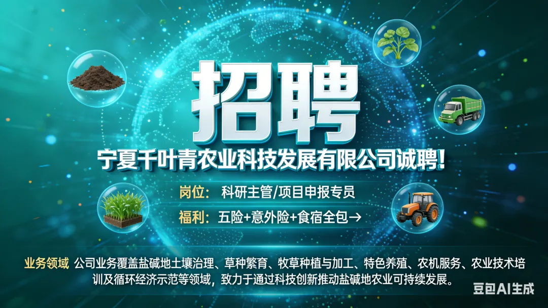 宁夏千叶青农业科技发展有限公司成立于2013年,是一家专注于盐碱地综合治理与农业全产业链发展的科技型企业。公司业务覆盖盐碱地土壤治理、草种繁育、牧草种植与加工、特色养殖、农机服务、农业技术培训及循环经济示范等领域,致力于通过科技创新推动盐碱地农业可持续发展。现因业务拓展需要,面向社会公开招聘科研主管和项目申报专员两个岗位,提供具有竞争力的薪资和完善的福利,欢迎相关专业人士加入!