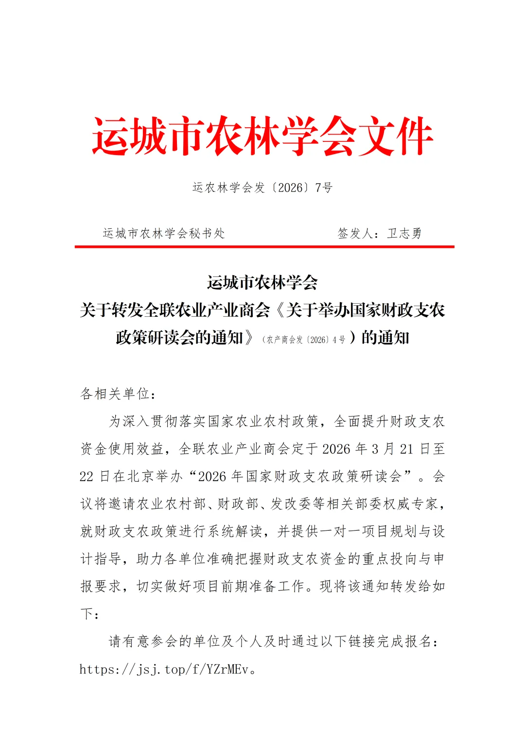 运城市农林学会关于转发全联农业产业商会《关于举办国家财政支农政策研读会的通知》(农产商会发〔2026〕4号)的通知