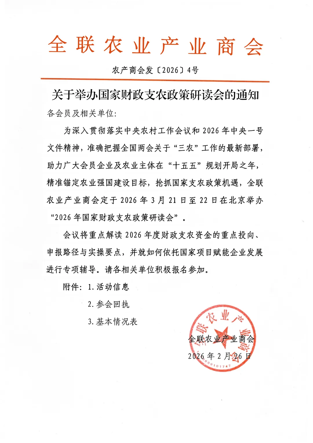 全联农业产业商会《关于举办国家财政支农政策研读会的通知》