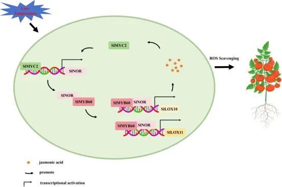 研究还发现,茉莉酸信号通路的核心转录因子SlMYC2可直接结合SlNOR启动子的G-box基序,激活SlNOR的表达,由此构建起“SlMYC2→SlNOR/SlMYB60→SlLOX10/11→JA”的层级调控通路,并实现了JA合成的正反馈。该通路在低温胁迫下可高效激活JA生物合成,通过促进ROS清除、维持细胞膜稳定性、保护光合系统等途径增强番茄低温耐受性。