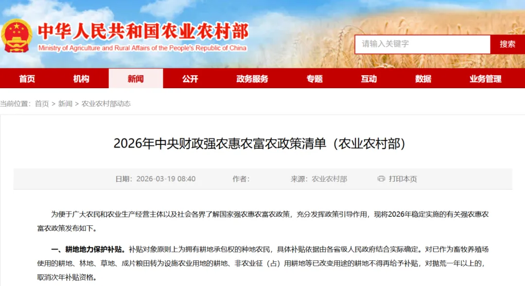 2026年3月19日,农业农村部消息,为便于广大农民和农业生产经营主体以及社会各界了解国家强农惠农富农政策,充分发挥政策引导作用,现将2026年稳定实施的有关强农惠农富农政策发布如下。