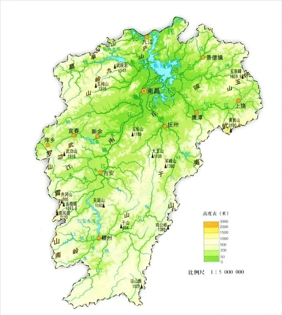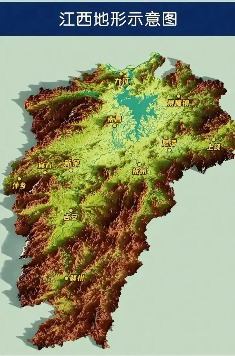 三面环山,东边的北端,以黄山的余脉——怀玉山,与安徽、浙江交界;东边的南端,以武夷山与福建相邻。江西的南面,是南岭之一的大庾岭,与广东分界;西边是以罗霄山脉和幕阜山脉与湖南、湖北接壤。北面是5000平方公里的鄱阳湖,以及160公里的长江岸线。