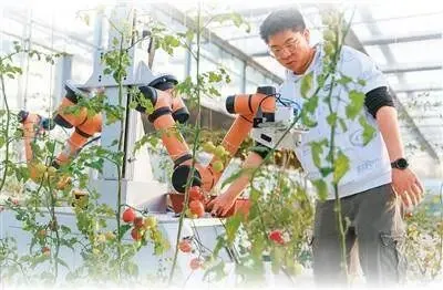 河南省漯河市一家生态农业庄园内,一台采摘机器人正在番茄种植大棚进行实地采摘试验。杨 光摄(人民图片)
