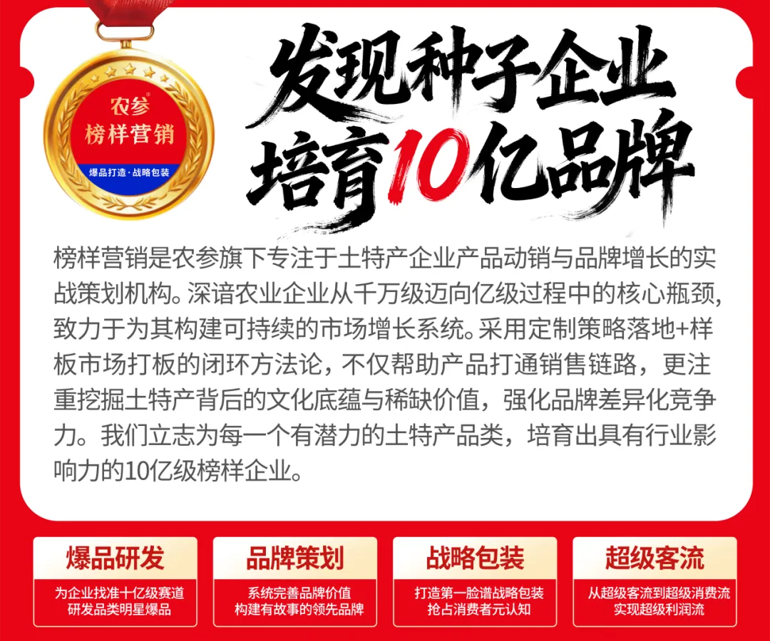 土特产如何从“农品”蜕变为“爆品”?即日起,农参榜样营销——专注土特产超级爆品策划的专家团队(核心业务:超级爆品策划、战略包装、DTC爆品模式),将推出“土特产爆品案例深解”系列专栏。