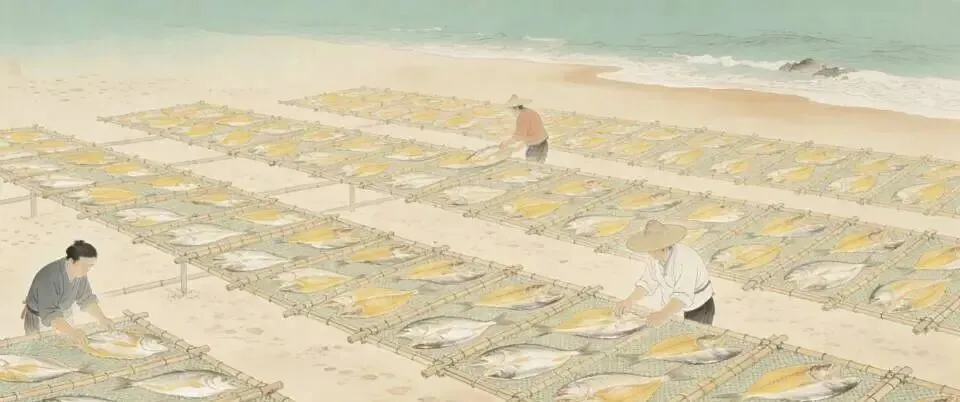 在1942年爵溪沦陷(被日本占领)之前,这座海边小镇曾拥有多达216家鲞厂,它们如繁星般密布,是当地渔业繁荣的有力见证。战时渔村经济遭受重创,直至抗战胜利后,才逐渐恢复生机,尚存160余家,顽强地延续着渔业加工的传统。这些鲞厂规模各异,大小不一,宛如一个多彩的渔业加工世界。规模较大的鲞厂,拥有厂舍10余间,工人数量可达10名左右,这类大厂在总数中约占一到二成。它们宛如渔业加工的巨头,有着较为宽敞的生产空间和相对充足的人力。次一级的鲞厂,厂舍数量在5-6间,工人有4-5人,这类鲞厂约占总数的三分之一。而其余的则多为规模较小的家庭式作坊,厂屋常常是临时搭建而成,甚至就在自家宅基地内进行劳作。一家人齐心协力,基本不雇佣外来工人,完全是家庭工厂的性质,充满了浓浓的家族式经营氛围。经营鲞厂的,大多是土生土长的爵溪本地人,他们凭借着对这片土地和海洋的熟悉与热爱,世代坚守着这份渔业加工的事业。城东沙堤上搭建的厂舍,大多显得低矮简陋,却承载着厚重的渔业加工历史。室内光线昏暗微弱,空气也颇为污浊,并且缺乏完善的污水统一纳管和处理装置。每间厂舍面积仅有约10平方米左右,空间十分局促。各厂舍之间,以腌桶排列作为隔断,这些腌桶每只高约一米,直径1.35米左右,其中三分之二深埋于泥地之中。每间厂舍能够放置腌桶3只,而每只腌桶大约可腌制黄鱼2000尾,这小小的空间里,却承载着大量鱼货的腌制任务。厂门右侧通常设置着盐仓,盐仓旁边铺搭着一块腌板,这是专门用于腌鱼敷盐的重要工具。厂舍的横梁之上,铺放着搁板,各种竹篰、晒帘、木桩等用具杂乱地堆置其上。厂门外,每当工作开始时,便会临时搭建起草棚,剖鱼取膘等操作就在这草棚之下进行。草棚之外便是沙滩,以厂基为界,各厂的区域伸展至海涂,彼此之间互不侵犯,仿佛有着一种无形的默契。沙滩之上,打有许多木桩,这些木桩高约4尺,两两之间横距2.5尺,直距一丈有余。桩顶带有叉口,在直距木桩之间,将毛竹搁置于桩叉之上,并缠绕以麻绳,形成了稳固的晒鲞架。晒帘是用小竹条精心编成,宽约3尺,长亦丈有余,依次铺搁在二竹之间,从厂棚口一直延伸至海边,排列成整齐的行列,鲞之卤片就在这些竹帘之上接受阳光的曝晒。晒帘行列的数量依据厂基大小而定,例如五间厂舍的鲞厂,大约可设置三列。列与列之间,特意留有通路,以便工人在操作过程中能够自由穿梭,进行各项工序。此外,五间厂舍以上规模的鲞厂,一般还会配备小舢舨1只,这小舢舨主要用于落海驳运黄鱼,在必要之时,比如黄鱼进货过多而腌桶容量不足时,还可将其拔上海涂,临时兼作腌桶使用。每只舢舨的腌制容量,大约可抵腌桶一只半至二只,在应对突发的大量鱼货时,发挥着重要的救急作用。剖鱼所用的刀具,形状略似板斧,有着扁薄的木柄,纯钢打造的刀刃锋利无比,能够轻松地划开鱼身。剖鱼用的凳子也别具特色,宽约6寸,长2.5尺,前脚高半尺,后脚高约八寸,整体略成斜面,人坐在后端进行剖鱼操作。前端凳面刻有对叉斜纹数条,这巧妙的设计能够有效防止鱼体在剖鱼过程中滑落,体现了渔民们在生产工具上的智慧与巧思。除此之外,还有盛鱼膘的竹箩、盛内脏的木桶等若干只,这些工具虽然简单质朴,却都是鲞厂生产中不可或缺的好帮手。以五间厂舍规模的鲞厂为例,其生产用具的配备有着一套相对固定的标准。腌桶:15只,每只腌鱼1600尾至2000尾,一次可进鱼2.5万尾至3万尾。