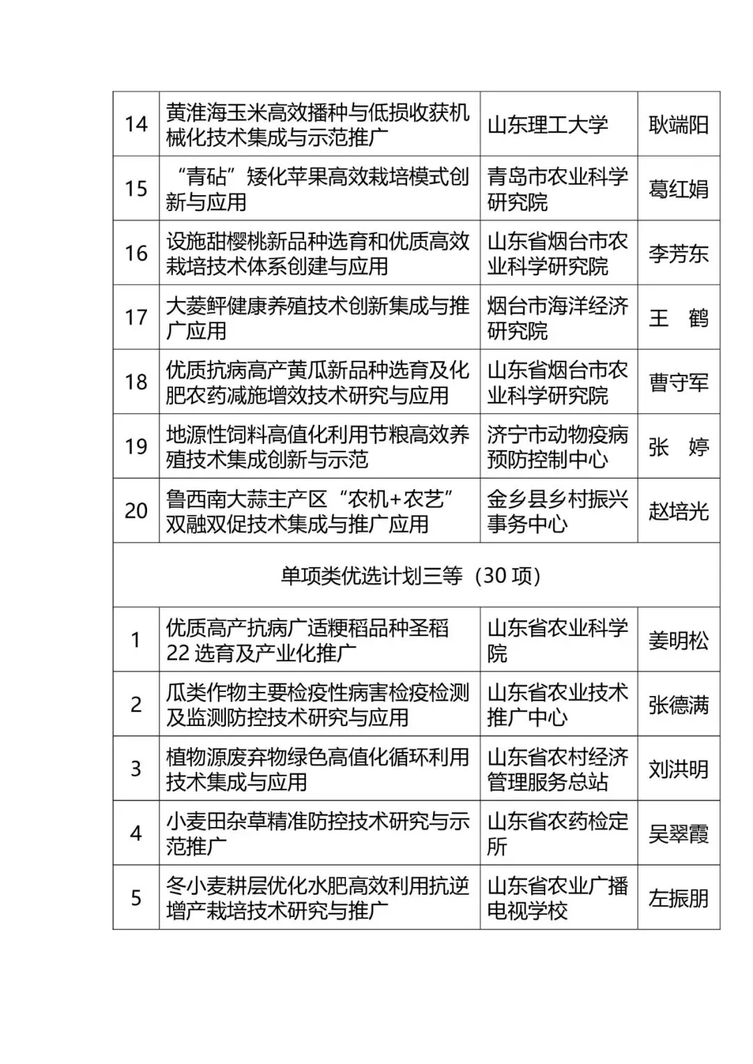 根据《关于做好2025年农业技术推广成果优选计划申报推荐工作的通知》(鲁农科教字〔2025〕14号),经专家评审和公示,共有63个项目被评为2025年山东省农业技术推广成果优选计划项目。其中,单项类优选计划项目60项(一等10项、二等20项、三等30项),合作类优选计划项目3项。现予公布。