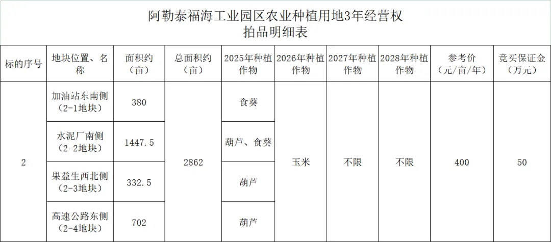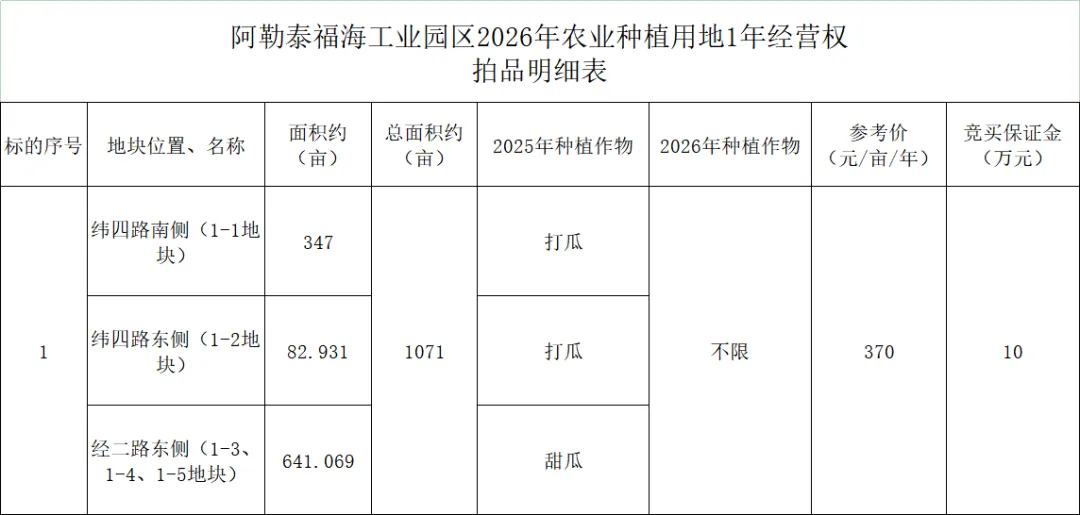 受委托,我公司定于2026年4月3日上午12:00在阿勒泰地区行政服务中心(阿勒泰地区公共资源交易中心)五楼拍卖厅举行拍卖会,届时对位于阿勒泰福海工业园区农业种植地1-3年经营权(合计面积共约:3933亩,分为2个标的拍卖,详见拍品清单)进行公开拍卖,具体明细如下: