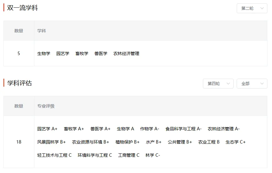 学科优势特色明显。首轮“双一流”成效评价,学校整体建设9项评价指标中,7项指标为第一档。生物学、园艺学、畜牧学、兽医学、农林经济管理5个学科再次滚动入选第二轮国家“双一流”建设学科。7个学科进入A类学科。14个学科进入ESI全球排名前1%,2个学科进入前1‰,1个学科进入前1‱,分布于农学、生命科学、理学、工学、医学、社会科学等6个门类。其中,进入前1%的学科(植物学与动物学、农业科学、生物学与生物化学、环境科学/生态学、微生物学、分子生物与遗传学)实现了农学、生命科学2个门类的全覆盖;进入前1‰的学科(植物学与动物学、农业科学)实现了农学门类的全覆盖。