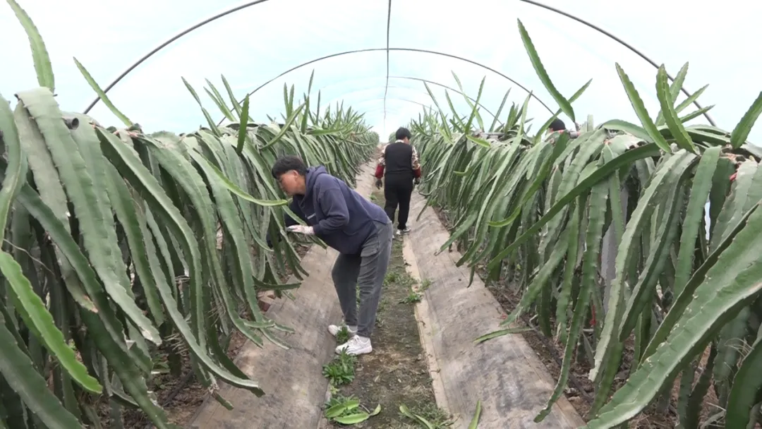 梦里田园农牧专业合作社负责人崔高领说:“我们有40个大棚,种植的都是火龙果,现在正是管护关键期,主要进行浇水、剪枝,我们这长年有十几个工人,都是周边村民。”