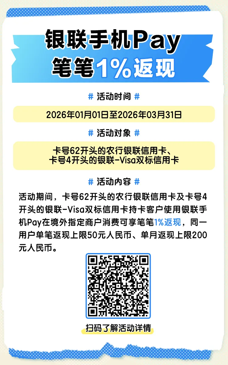 >出境省钱 先用银联|农行银联乐享家庭卡,境外消费笔笔1%返现无上限