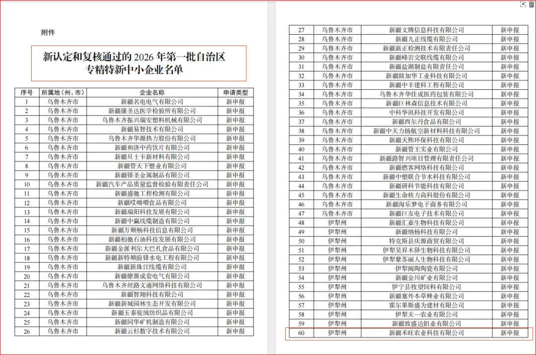 近日,新疆维吾尔自治区工业和信息化厅正式公示2026 年第一批自治区专精特新中小企业名单,新疆禾旺农业科技有限公司凭借专业化、精细化、特色化、新颖化的综合实力,成功新认定为自治区专精特新中小企业,荣耀上榜!