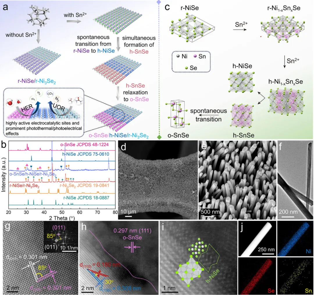 2. XRD表征显示Sn2+的引入使r-NiSe峰消失,同时出现h-NiSe和o-SnSe特征峰,证实Sn2+可触发r-NiSe向h-NiSe的相变