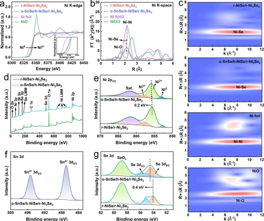 1. Ni K边XANES显示o-SnSe/h-NiSe/r-Ni3Se2的Ni吸收边能量高于r-NiSe/r-Ni3Se2,表明Ni价态升高