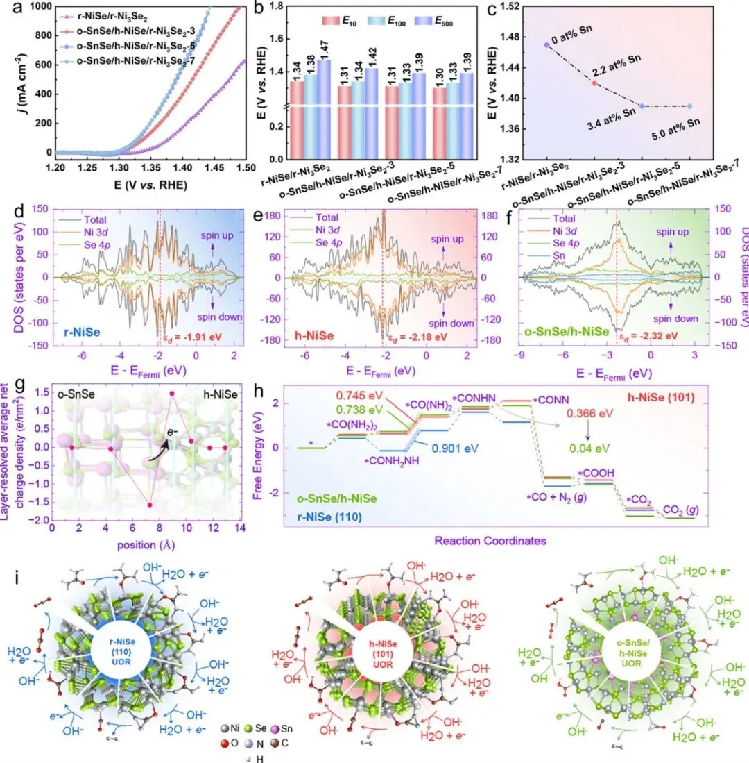 5. UOR决速步(*CONH2NH -> *CO(NH)2)能垒从r-NiSe的0.901eV降低至h-NiSe的0.745eV和o-SnSe/h-NiSe的0.738eV