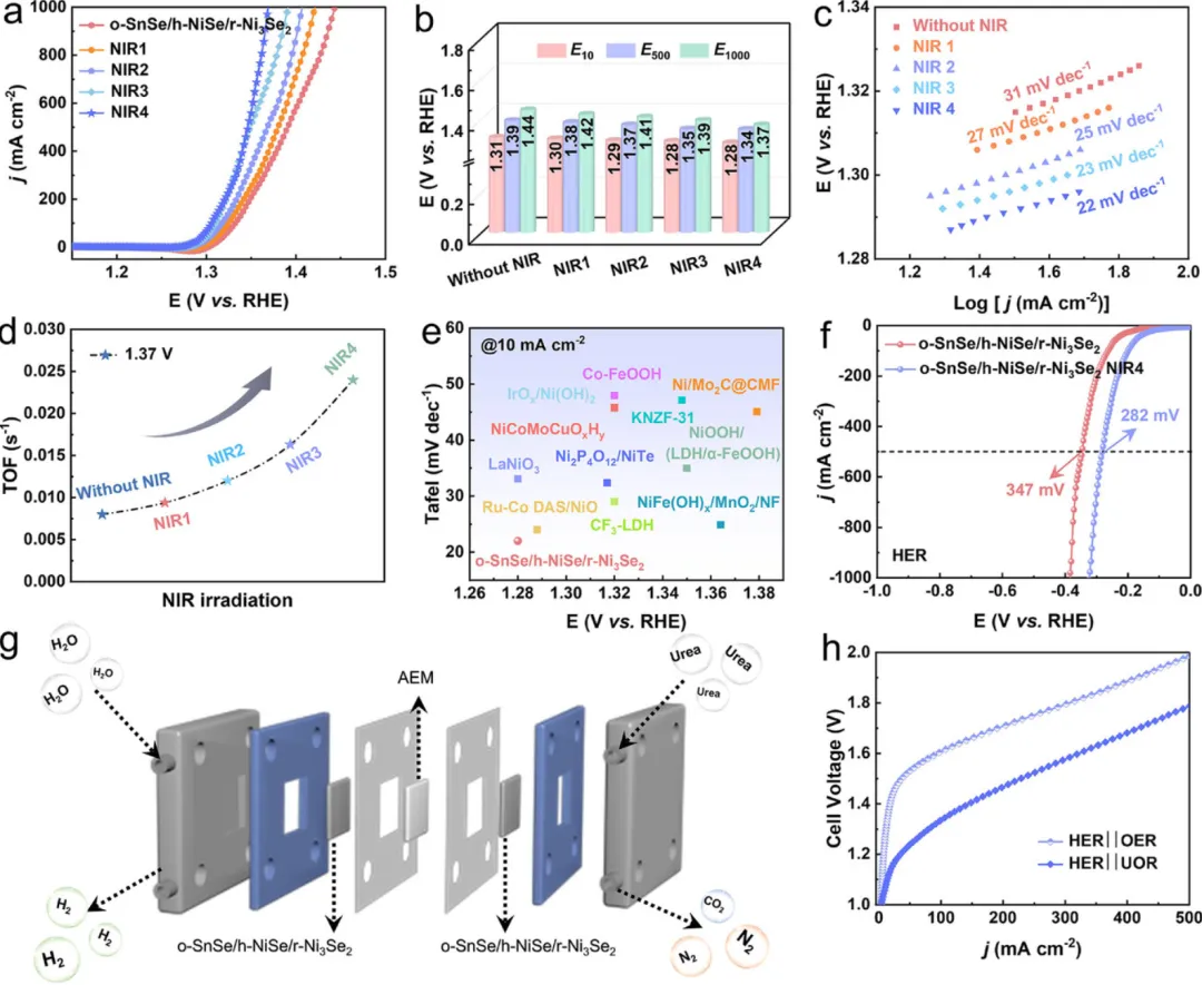 4. 近红外照射下UOR活化能从48.4降低至9.7kJ mol-1,o-SnSe/h-NiSe/r-Ni3Se2仅需1.28/1.34/1.37V即可实现10/500/1000mA cm-2