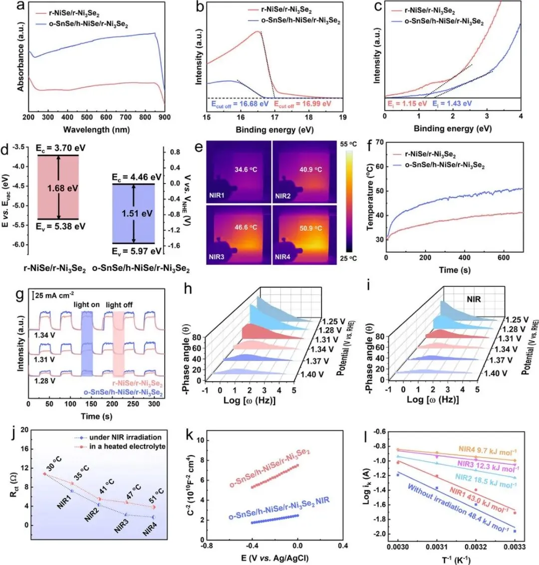 1. UV-vis-NIR显示o-SnSe/h-NiSe/r-Ni3Se2具有比r-NiSe/r-Ni3Se2更强的宽带光吸收能力