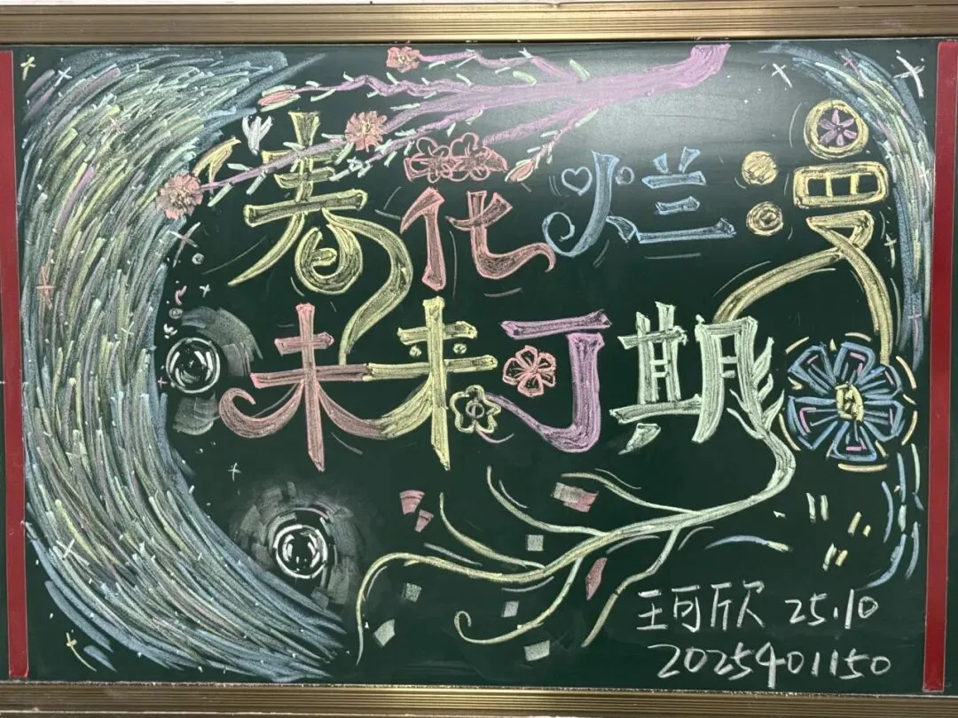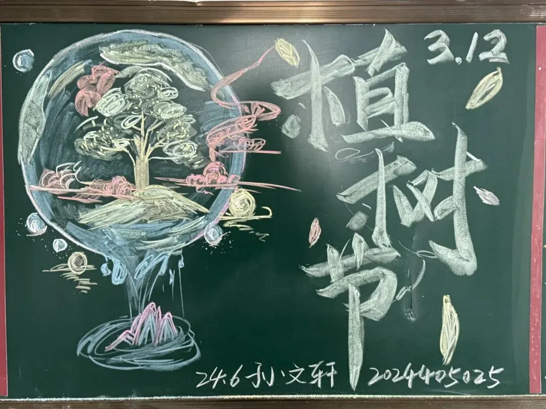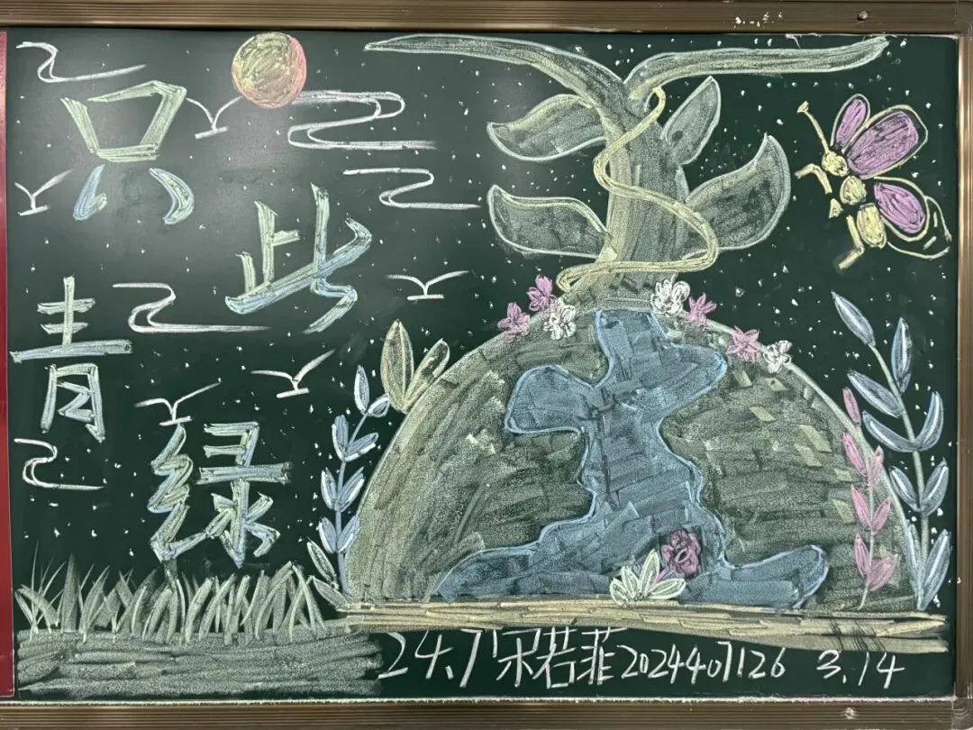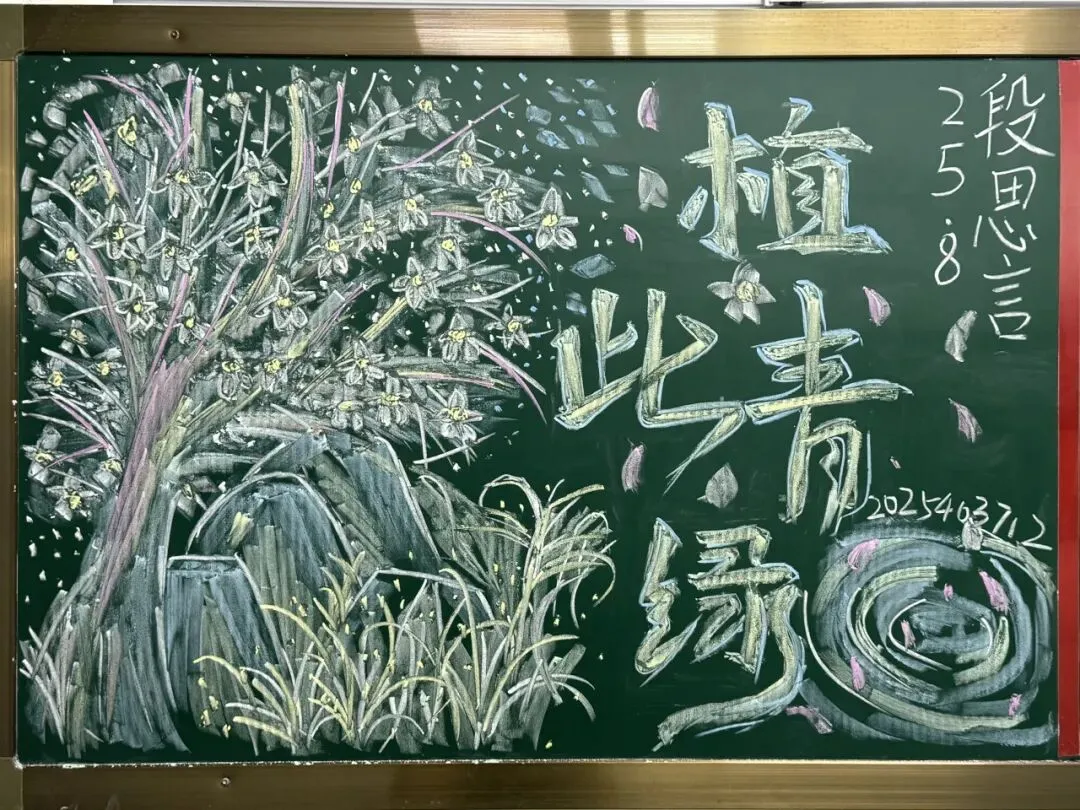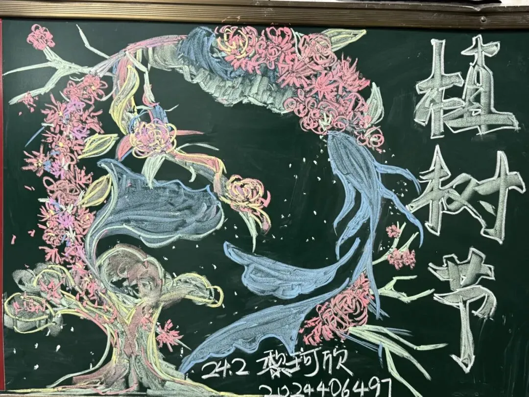 同学们紧扣植绿护绿、生态环保等主题,充分发挥想象力与创造力,用彩色粉笔精心绘制出一幅幅主题鲜明、内容丰富、形式多样的黑板报。