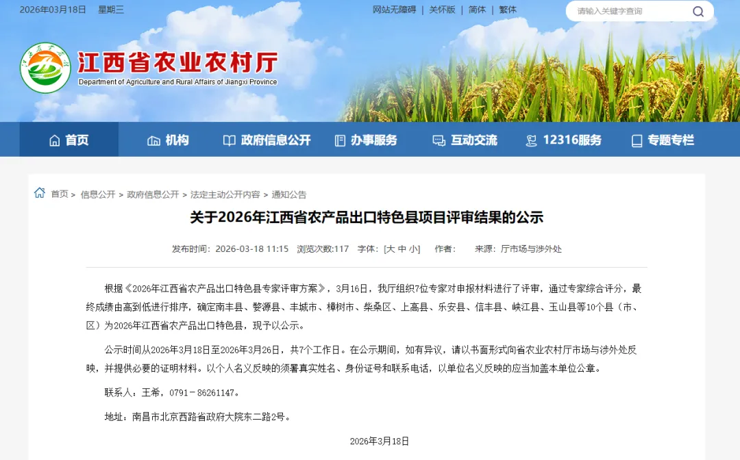 根据《2026年江西省农产品出口特色县专家评审方案》,3月16日,我厅组织7位专家对申报材料进行了评审,通过专家综合评分,最终成绩由高到低进行排序,确定南丰县、婺源县、丰城市、樟树市、柴桑区、上高县、乐安县、信丰县、峡江县、玉山县等10个县(市、区)为2026年江西省农产品出口特色县,现予以公示。