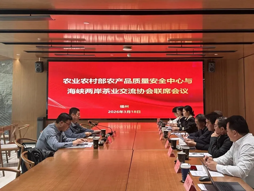 3月18日下午,农业农村部农产品质量安全中心与海峡两岸茶业交流协会(以下简称“海茶会”)在海峡两岸茶业交流协会会议室召开联席会议。会议由海峡两岸茶业交流协会副会长兼秘书长张贵明主持,农业农村部农产品质量安全中心主任孔亮、中心办公室处长张锋,海峡两岸茶业交流协会副会长姜绍丰、祝芸,常务副秘书长吴桂荣等有关同志参加会议。会议围绕促进农业农村部社会组织高质量发展、党建引领、内部治理、标准化建设、两岸茶产业协同发展等议题展开深入交流。