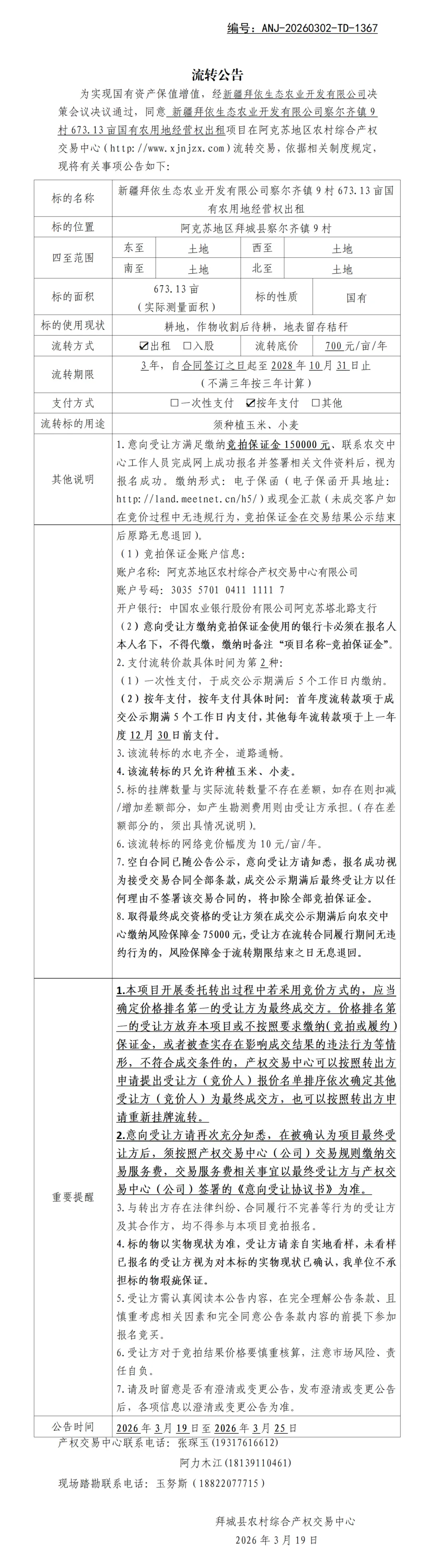 阿克苏地区丨新疆拜依生态农业开发有限公司察尔齐镇9村673.13亩国有农用地经营权出租项目流转公告