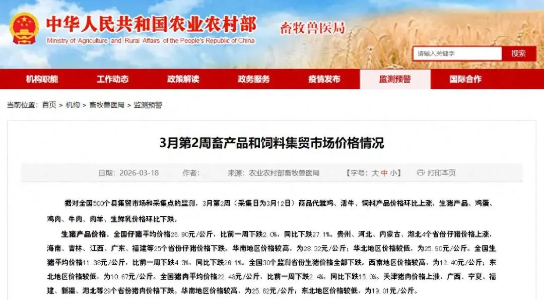 生猪方面,3月第2周(以下简称“本周”),全国30个监测省份生猪价格全部下跌!自2月份以来,猪价行情已连续下跌6周时间,单周跌幅也从最开始的1.2%扩大至本周的4.3%,就当前5块钱的猪价水平而言,同比去年大跌26.1%,已逼近2018年的历史最低值。