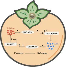 该研究通过转录组分析鉴定了两个分别响应乙烯和ABA信号的NAC转录因子。DkNAC26增强了参与脱落酸生物合成的DkNCED2+3’的转录活性,从而增加了脱落酸的积累,加速了柿果实软化过程。而DkNAC28与DkACS1(乙烯生物合成的关键基因)的启动子结合,从而促进内源性乙烯的生成并加速柿果实软化。