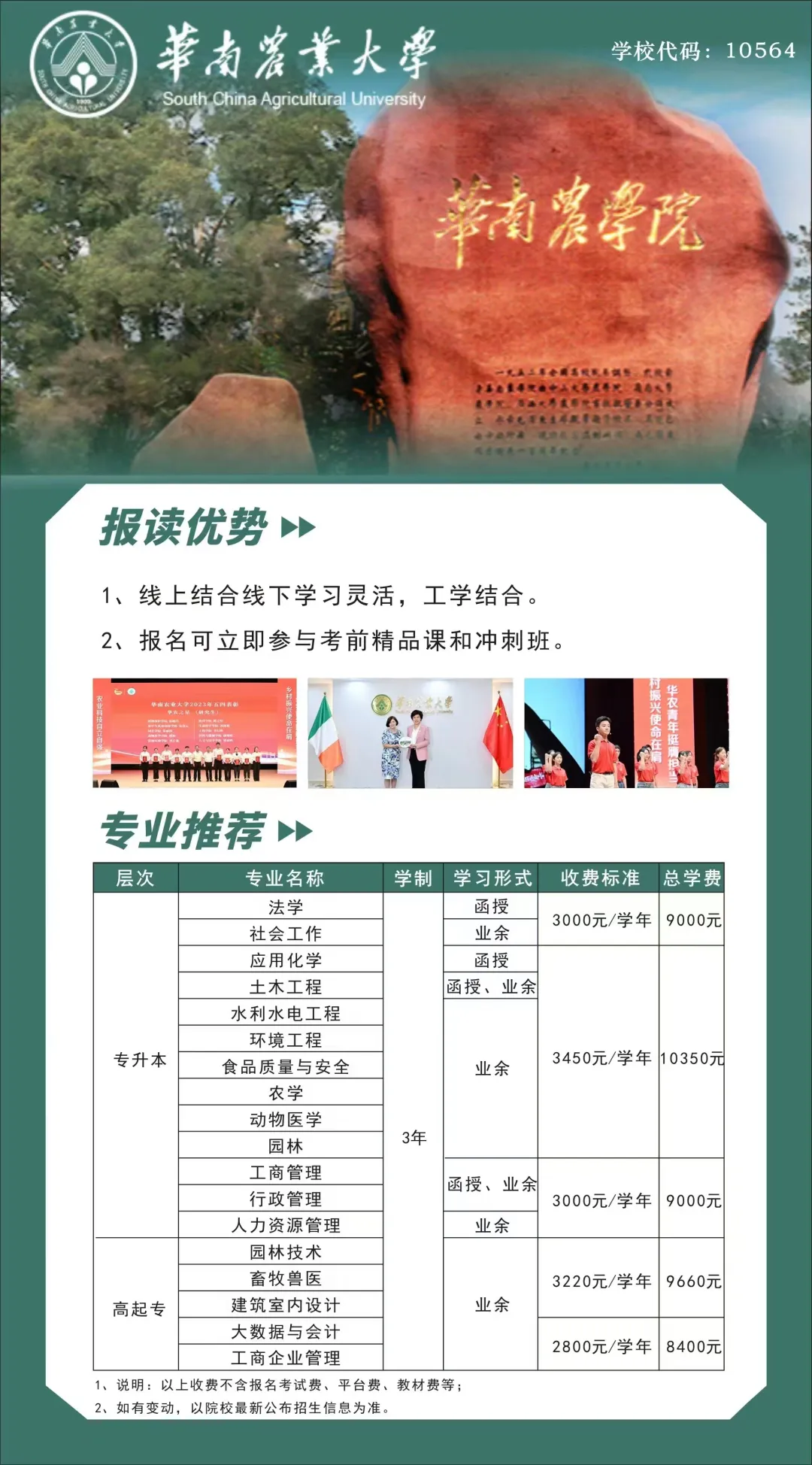 华南农业大学的继续教育历史悠久,早在1955年就创立了首批教职工马列主义夜大学,1957年创办函授部,是新中国成立后较早举办成人高等学历教育的普通高等院校之一。继续教育依托学校雄厚的师资力量和优良的办学条件,在读成人高等学历教育学生近1.9万人,先后为社会输送了4.5万名成人高等教育毕业生;高等教育自学考试在考学生规模4万多人,自考毕业生累计近5万人。