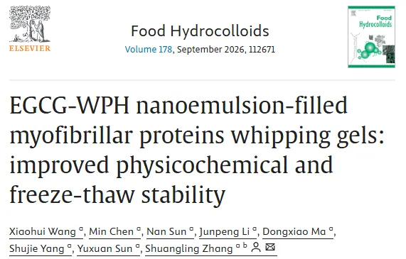 Food Hydrocolloids| 负载 EGCG-WPH 纳米乳液的肌原纤维蛋白打发凝胶:理化特性与冻融稳定性的提升