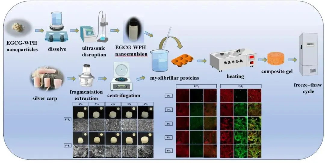 鱼糜制品因营养与质构优势成为水产加工主流产品,随着海水鱼类资源减少,鲢鱼成为优质替代原料。冷冻是鱼糜储运的关键技术,但冷链波动引发的反复冻融会形成冰晶,破坏肌原纤维蛋白(MPs)结构,导致其氧化变性、聚集,进而劣化凝胶质构、持水性与感官品质。传统蔗糖、山梨醇等防冻剂虽有效,但存在高甜、高热量缺陷。现有研究表明,表没食子儿茶素没食子酸酯(EGCG)可与蛋白作用增强凝胶特性,乳清蛋白水解物(WPH)能保护蛋白结构,纳米乳液递送体系可提升多酚稳定性,然而将 EGCG-WPH 纳米乳液用于增强肌原纤维蛋白凝胶冻融稳定性的研究仍较为缺乏。为此,本研究构建复合凝胶,系统解析其作用机制,为开发低糖、高品质冷冻鱼糜提供理论支撑。