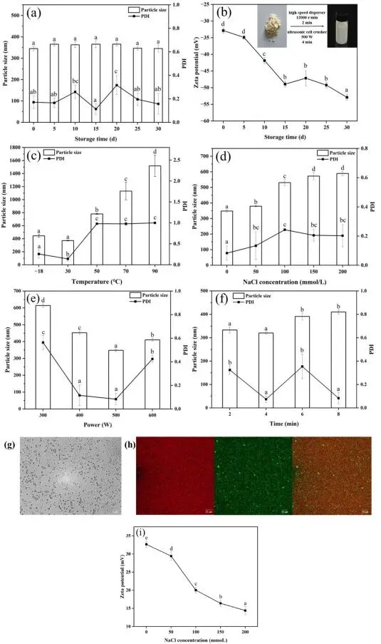 Fig. 1. Particle size and PDI of EGCG-WPH nanoemulsions (0.5%, w/v) under environmental stress. (a) Particle size, PDI, and (b) zeta potential of nanoemulsions stored at 4 °C for 30 d; (c) Nanoemulsions treated at different temperatures (−18, 30, 50, 70, and 90 °C) for 1 h; (d) and (i) Nanoemulsions treated at different NaCl concentrations (0, 50, 100, 150, and 200 mmol/L) for 1 h, 25 °C; (e) Nanoemulsions treated at different power (300, 400, 500, and 600 W) for 4 min; (f) Nanoemulsions treated at different time (2, 4, 6, and 8 min) for the power of 500W; (g) Optical microscope (100 × ) and (h) CLSM images (20 × ) of EGCG-WPH nanoemulsions (0.5%, w/v). Note: Different lowercase letters (a-e) represent statistically significant differences between sample groups (p < 0.05).