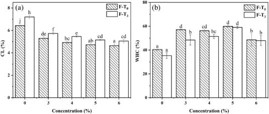 Fig. 2. Cooking loss (a) and water-holding capacity (b) of composite gels (0, 3, 4, 5, and 6%, v/v, 0.5% EGCG-WPH nanoemulsion) before (F-T0) and after (F-T3) three freeze-thaw cycles (−18 °C/48 h, 4 °C/12 h). Note: Distinct lowercase letters (a-j) indicate statistically significant differences among the samples at the 5% significance level. F-T0, before three freeze-thaw cycles; F-T3, after three freeze-thaw cycles; CL, cooking loss; WHC, water-holding capacity.