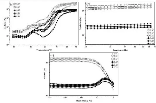 Fig. 3. Effect of (a) temperature, (b) frequence and (c) shear strain on storage modulus (G′) and loss modulus (G″) of EGCG-WPH filled MPs composite gels (0, 3, 4, 5, and 6%, v/v, 0.5% EGCG WPH nanoemulsion).