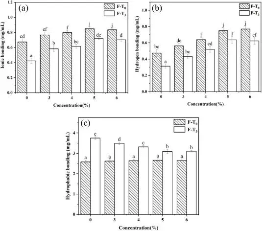 Fig. 4. Changes in ionic bonding (a), hydrogen bonding (b), hydrophobic bonding (c) of EGCG-WPH composite gels (0, 3, 4, 5, and 6%, v/v, 0.5% EGCG-WPH nanoemulsion) before (F-T0) and after (F-T3) freeze-thaw cycles (−18 °C/48 h, 4 °C/12 h). Note: Distinct lowercase letters (a-j) indicate statistically significant differences among the samples at the 5% significance level. F-T0, before three freeze-thaw cycles; F-T3, after three freeze-thaw cycles.