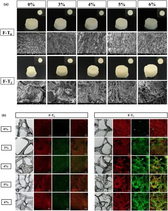 Fig. 5. (a) SEM images (300 × ), (b) optical microscope (100 × ) and CLSM images (20 × ) of composite gels (0, 3, 4, 5, and 6%, v/v, 0.5% EGCG-WPH nanoemulsion) before (F-T0) and after (F-T3) three freeze-thaw cycles (−18 °C/48 h, 4 °C/12 h). Note: F-T0, before three freeze-thaw cycles; F-T3, after three freeze-thaw cycles.