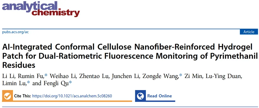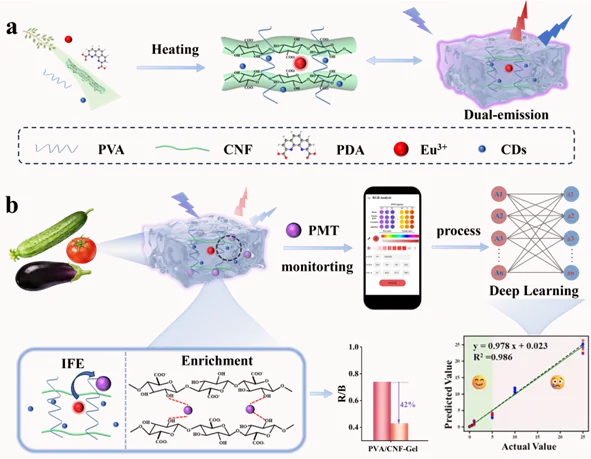 本研究提出了一种基于聚乙烯醇/纤维素纳米纤维复合网络的双发射比率荧光水凝胶(PVA/CNF/Eu-MOF/CDs)传感器,用于嘧霉胺的高灵敏度、高保真原位检测。利用纤维素基水凝胶为活性识别骨架,通过其羟基与纤维结构强化农药富集与传质,同时构建原位合成的双发射比率荧光体系以实现自校准抗干扰。进一步结合反向传播人工神经网络(BP-ANN)处理多维度信号,校正环境与操作误差,实现食品及环境样品中PMT的实时原位、高灵敏检测。