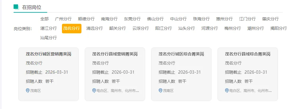 包括城区营销菁英岗、城区综合菁英岗和广州城区客服经理岗。主要为我行城区机构培养和储备零售、对公金融营销服务人才,财富管理、投行资管、国际金融、绿色金融、业务运营、信息科技、财务会计、风险控制、法律合规等专业或管理型人才。