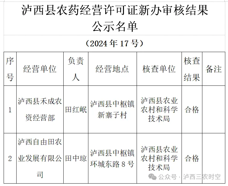 根据《农药管理条例》、《农药经营许可证管理办法》和《云南省农药经营许可实施办法》等规定,下列农药经营许可申请者通过我局农药经营许可审核小组材料审查和实地核查,符合农药(限制使用农药除外)经营许可证新办条件,现予以公示。公示期7个工作日,2024年8月16日至2024年8月27日。公示期间若有异议,请向泸西县农业农村和科学技术局办公室反映。泸西县农业农村和科学技术局联系电话:0873—6629782驻县农业农村和科学技术局纪检组联系电话:0873—6699459公示时间:2024年8月16日至2024年8月27日