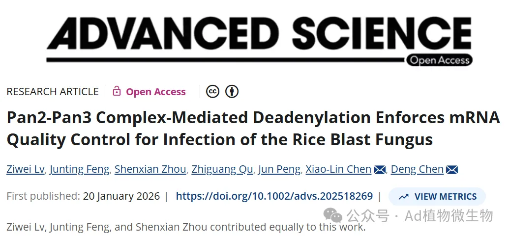 近日,中国热科院环植所的植物病害研究团队和华中农业大学陈小林教授等团队合作在探索去腺苷酸化调控稻瘟病菌致病性的分子机制方面取得了显著进展。他们首次全面揭示了Pan2-Pan3去腺苷酸化复合体如何通过影响mRNA的质量控制来协调稻瘟菌附着胞成熟、自噬及代谢重编程的过程,为研发针对RNA代谢的新颖作物病害防控策略提供了新的视角。这项以“Pan2-Pan3 Complex-Mediated Deadenylation Enforces mRNA Quality Control for Infection of the Rice Blast Fungus”为题的研究成果已在《Advanced Science》上发表。此前,华中农业大学陈小林教授团队还在Cell子刊《Developmental Cell》发表了题为“tRNA-m1A Methylation Controls the Infection of Magnaporthe oryzae by Supporting Ergosterol Biosynthesis”的相关研究成果,点击阅读: