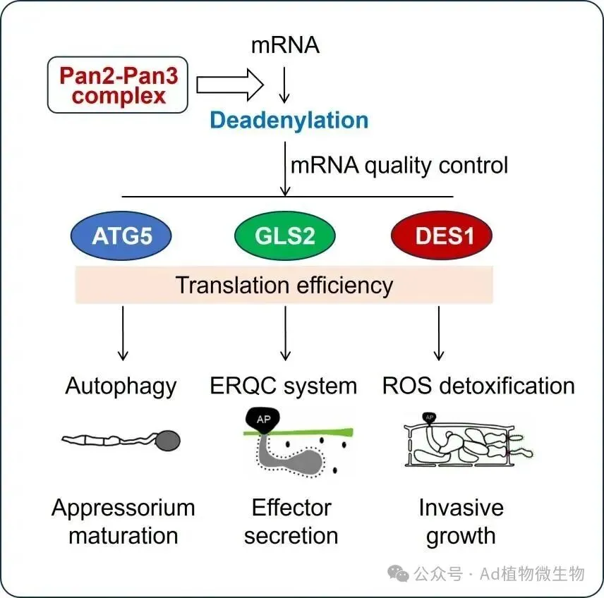 在这项研究中,团队识别出了稻瘟病菌中的两个保守亚基Pan2和Pan3,它们共同组成功能性复合体并位于P-body细胞器内。实验表明,此复合体能够直接对mRNA的poly(A)尾进行修剪,表现出去腺苷酸化活性。当Pan2或Pan3单个缺失或同时缺失时,突变体表现出营养生长减慢、致病能力减弱、附着胞形成延迟以及糖原和脂质动员效率降低的现象。进一步的研究证实,自噬调控基因ATG5、内质网质量控制基因GLS2以及活性氧解毒基因DES1均为Pan2-Pan3复合体的直接靶标,说明该复合体通过调节这些基因的mRNA稳定性来促进蛋白质的有效翻译,从而影响稻瘟菌的侵染能力。