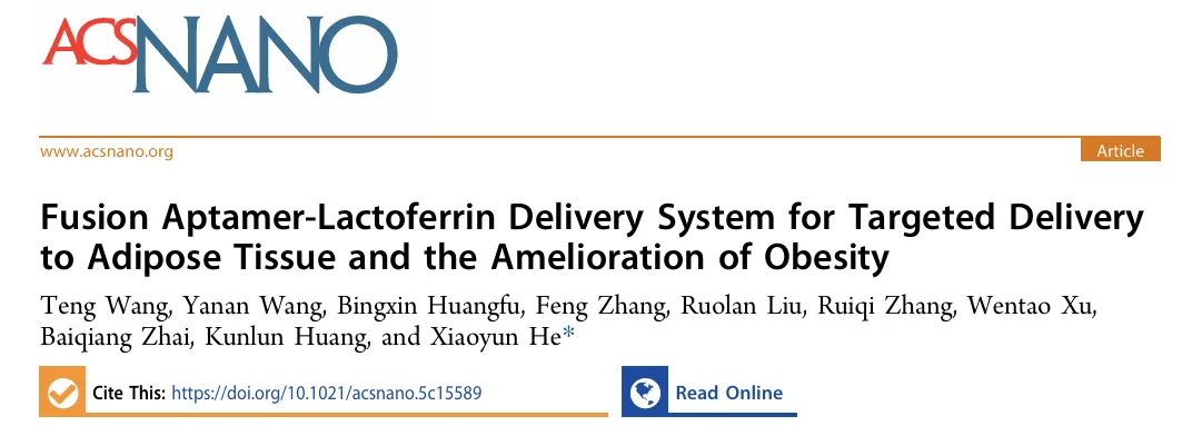 近日,中国农业大学食品科学与营养工程学院贺晓云副教授团队在国际权威期刊《ACS Nano》上发表了一项突破性研究成果。该论文题为《Fusion Aptamer-Lactoferrin Delivery System for Targeted Delivery to Adipose Tissue and the Amelioration of Obesity》,详细阐述了一种名为“融合适配体 - 乳铁蛋白递送系统”(LFNA)的新型纳米载体。这项研究旨在攻克当前纳米技术在肥胖治疗领域面临的一大难题:在肥胖状态下,脂肪组织的过度扩张与血管生成速度不匹配,导致物质扩散距离显著增加至140至180微米,从而严重阻碍了传统纳米载体向脂肪组织深部的有效渗透。尽管现有的靶向递送系统在特异性识别、载药量及生物相容性等方面已取得长足进步,但在提升组织穿透力方面仍存在明显短板。