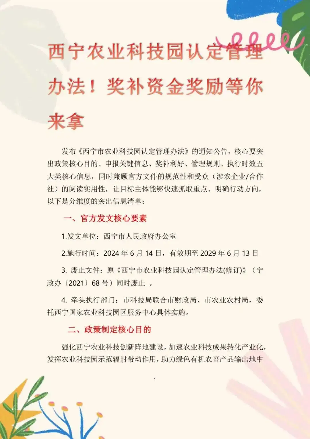 >西宁农业科技园认定管理办法,奖补资金奖励等你来来!